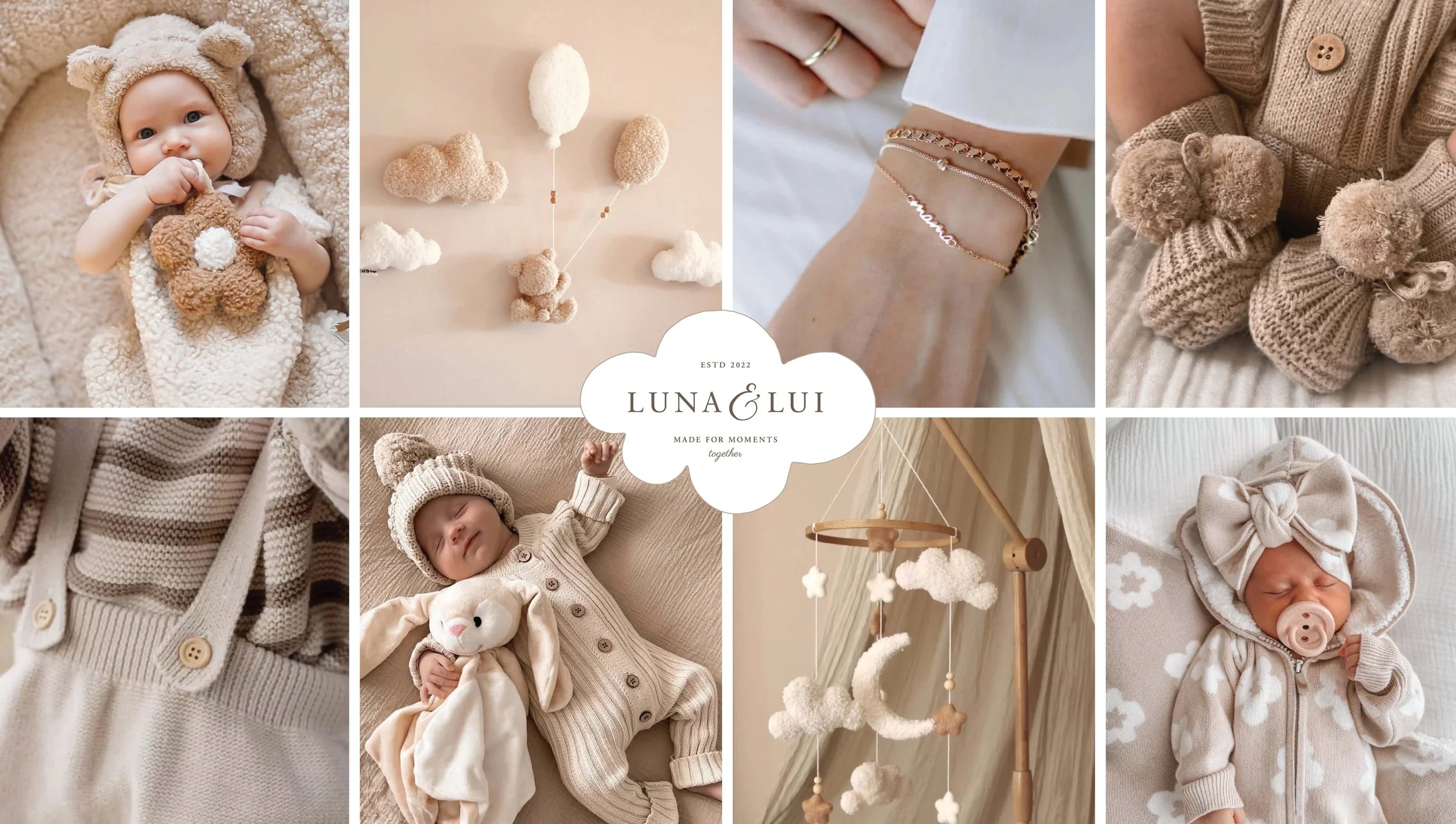 Luna & Lui curates beautiful, high-quality clothing and accessories for babies, children and parents who value thoughtful living. The visual identity reflects a balance of refinement and warmth seen within the beautiful pieces the brand sells. Clean, minimal forms create a sense of understated luxury, while subtle hand-drawn elements add a soft human touch. A neutral, earthy palette reinforces a feeling of calm, comfort and timelessness.